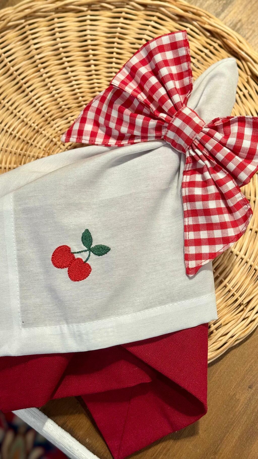 Este guardanapo branco com cerejas bordadas é a escolha perfeita para quem deseja adicionar um charme especial à sua decoração. Seu design sofisticado brilha sozinho, mas também é incrível para criar uma composição harmoniosa com outros guardanapos.