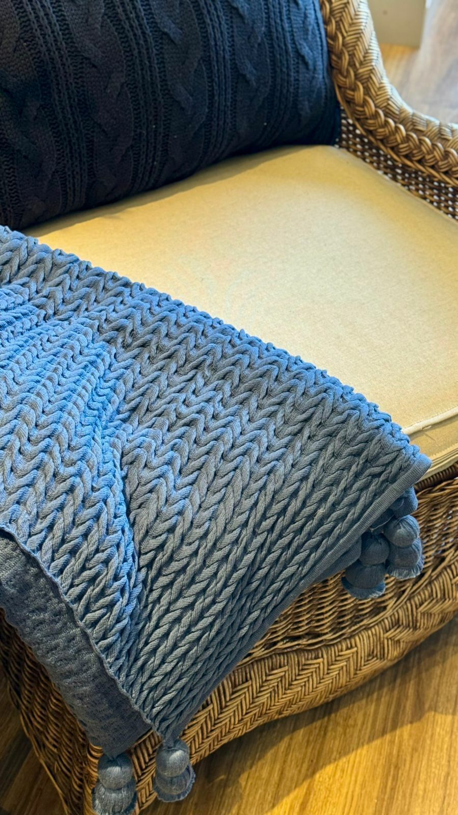Descubra a sofisticação da Manta Calmaria Azul, confeccionada em 100% algodão para máxima maciez e durabilidade. Seu design atemporal é perfeito para adicionar um toque chique a qualquer ambiente. Disponível com ou sem pompom nas laterais, oferece versatilidade e charme únicos para aquecer suas noites com estilo.
